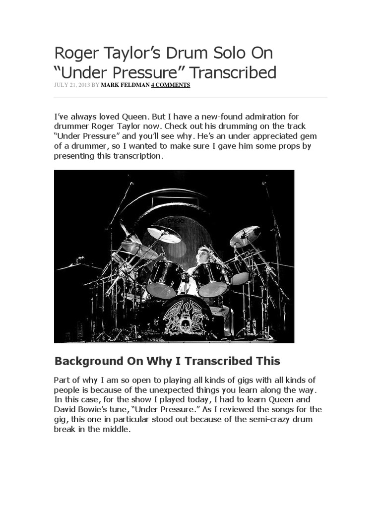 In this video i will show you the most important grooves from the song under pressure by queen. Here's the free pdf of the drum sheet music of the queen and david bowie classic, under pressure! enjoy! Download the pdf & guitar pro file at: Discover drum solo pdf transcriptions format to help you learn & improve your jazz drumming skills. First i show you the intro from the song and also the transit. Complete and annotated drum sheet music (score) in pdf format for the song under pressure by queen. Whether it’s a concert score or ac/dc pdfs, this guide will teach you the basics of reading and writing drum notation from the first quarter note to the final cymbal crash. “under pressure” is in the key of d major — two half steps up from c. If you’re working in a daw , you can click and drag the notes of the c major scale outlined above up two half. This score is real drum music and not a.